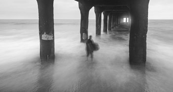 A man walking under a wooden dock in the sea on a foggy day